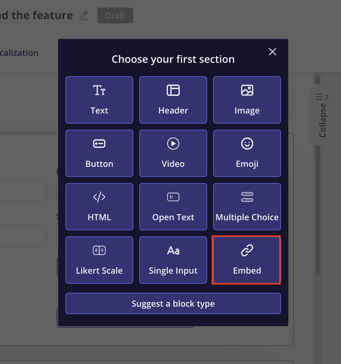 Userpilot’s embed feature allows you to enhance user experiences by seamlessly integrating content from popular platforms directly into your flows. With just a click, you can embed tools like Calendly, Loom, Typeform, and Synthesia, making it easier to engage users, collect feedback, and provide dynamic content, all without leaving your site.Use Cases