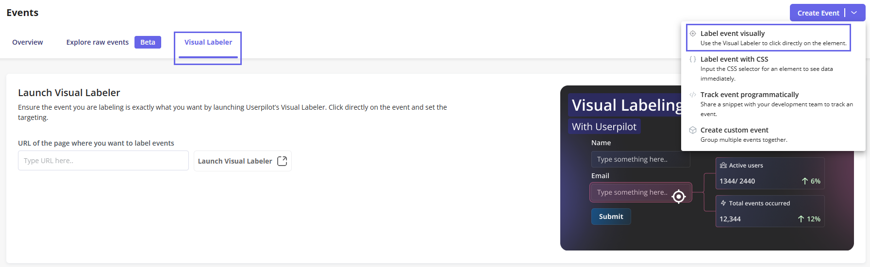 Visual Labeler: This option will allow you to directly enter your web app with Userpilot’s builder to click on the desired element you want to track.