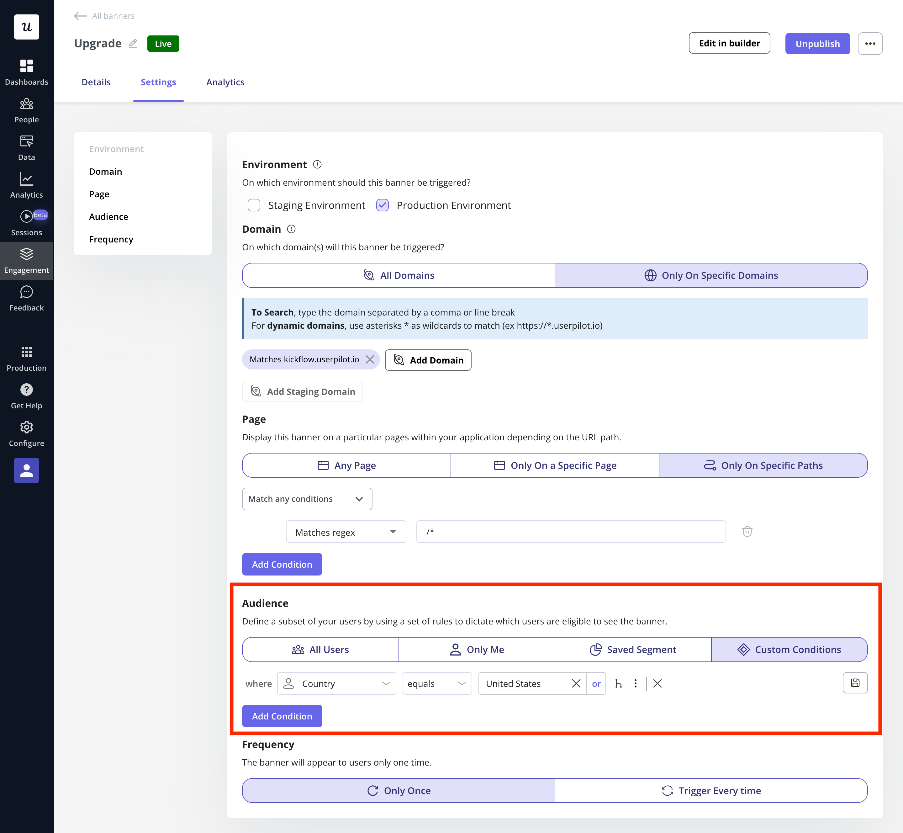 You can define the audience who will see the Banner, narrowing it down based on specific criteria:- All Users (default): Show the Banner to everyone who visits the targeted page(s).