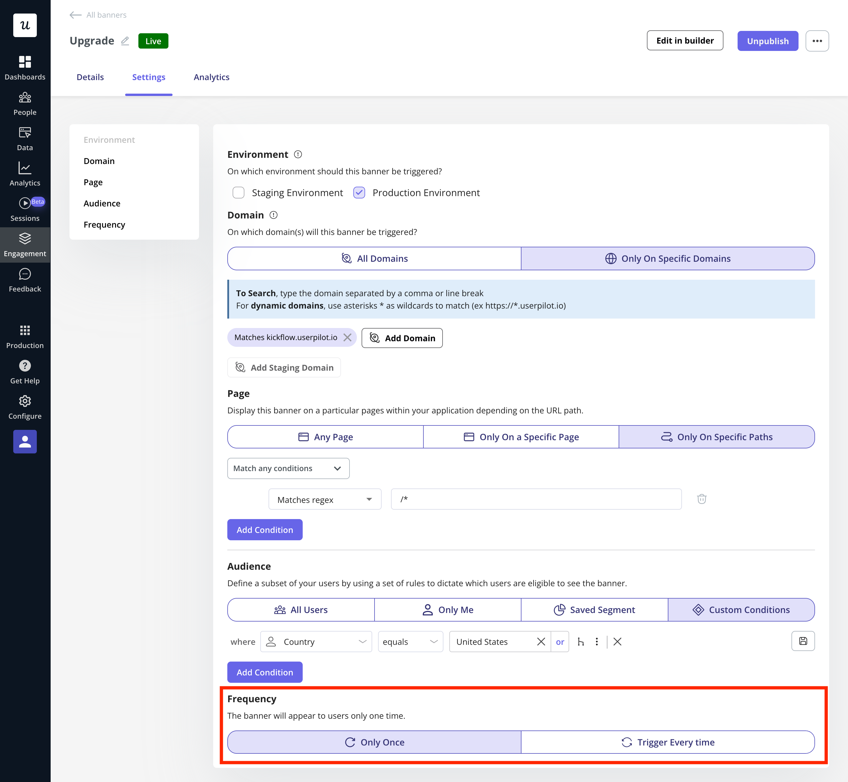 Control the appearance of your Banner on different pages within your application:- Any page (default): The Banner shows across all pages with the Userpilot snippet.