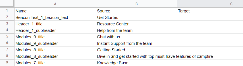 Enter the translation of each row into the ‘Target’ column