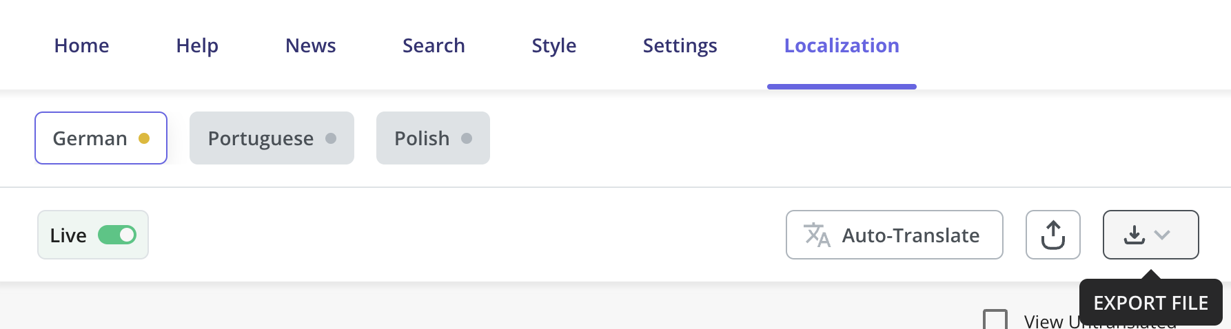 - Once you are confident that your content looks fine, import the file and just toggle the “Live” option, and a green indicator should appear for that specific language.